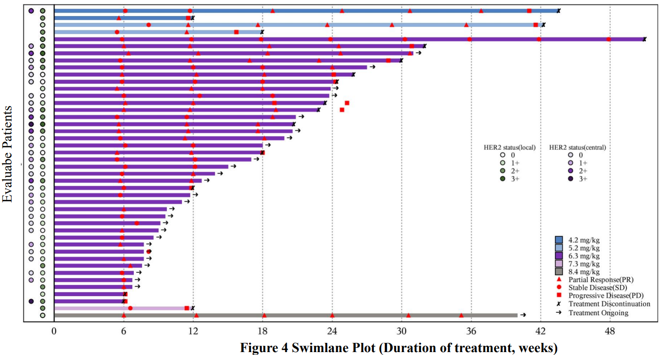 As of July 15, 2024, 50 patients with PROC had received JSKN003 across five dose levels, among which 2 patients at the dose of 4.2mg/kg, 2 patients at the dose of 5.2mg/kg, 44 patients at the dose of 6.3mg/kg, 1 patient at the dose of 7.3mg/kg, and 1 patient at the dose of 8.4mg/kg. Among the enrolled 50 patients based on the central laboratory testing, there were 17 patients with HER2 expression (IHC 1+, 2+ and 3+) (only 2 patients with HER2 IHC 3+), 17 patients with IHC 0, and 16 patients had no HER2 results because they had not been tested by July 15. 28 patients (56.0%) had at least three prior lines of systemic treatment, 37 patients (74.0%) had received bevacizumab treatment, and 28 patients (56.0%) had received PARP inhibitor treatment.