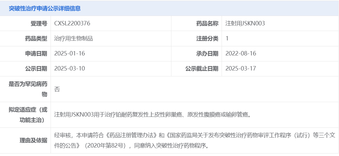 On March 18, 2025,Alphamab Oncology announced that anti-HER2 biparatopic antibody-drug conjugate (ADC) JSKN003 has been granted Breakthrough Therapy Designation by the Center for Drug Evaluation (CDE) of the National Medical Products Administration (NMPA). The designation is for the treatment of platinum-resistant recurrent epithelial ovarian cancer (PROC), primary peritoneal cancer, or fallopian tube cancer, not restricted to HER2 expression levels.