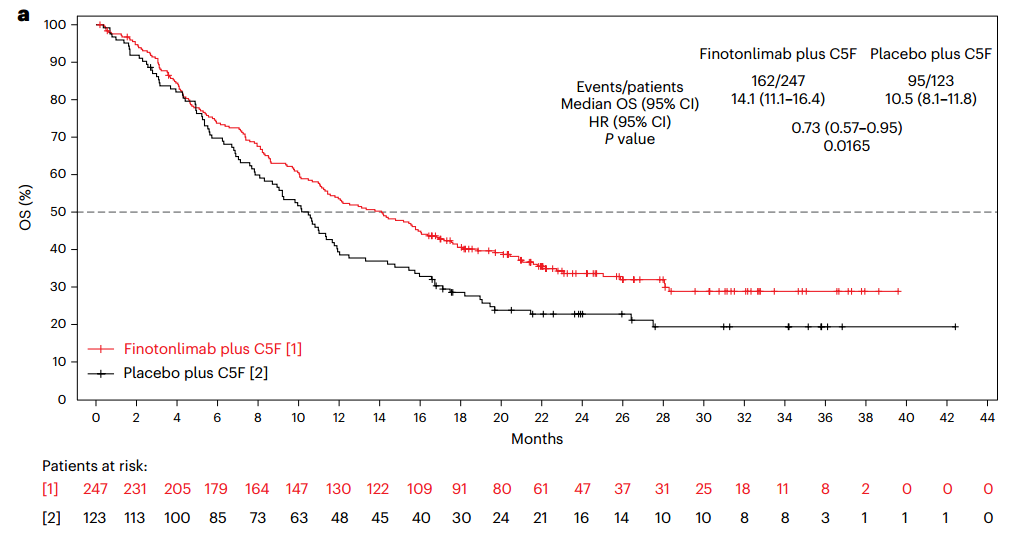 A randomized, double-blind phase 3 trial evaluated the efficacy and safety of finotonlimab (SCT-I10A), a programmed cell death 1 (PD-1) monoclonal antibody, combined with cisplatin plus 5-fluorouracil (C5F) for the first-line treatment of R/M HNSCC. Eligible patients (n = 370) were randomly 2:1 assigned to receive finotonlimab plus C5F (n = 247) or placebo plus C5F (n = 123). The primary endpoint was overall survival (OS). In the finotonlimab plus C5F group, OS was 14.1 months (95% confidence interval (CI) 11.1–16.4), compared with 10.5 months (95% CI 8.1–11.8) in the placebo plus C5F group. The hazard ratio was 0.73 (95% CI 0.57–0.95, P = 0.0165), meeting the predefined superiority criteria for the primary endpoint. Finotonlimab plus C5F showed significant OS superiority compared with C5F alone and acceptable safety profile with R/M HNSCC, supporting its use as a first-line treatment option for R/M HNSCC. These results validate the efficacy and safety of the combination of finotonlimab and C5F in Asian patients with R/M HNSCC.