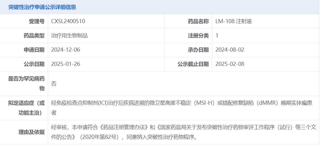 On January 26, 2025, the Center for Drug Evaluation (CDE) of the China National Medical Products Administration announced that LM-108 injection is intended to be included in breakthrough therapy for advanced solid tumors with microsatellite instability (MSI-H) or mismatch repair defects (dMMR) that have progressed after treatment with immune checkpoint inhibitors (ICI).
