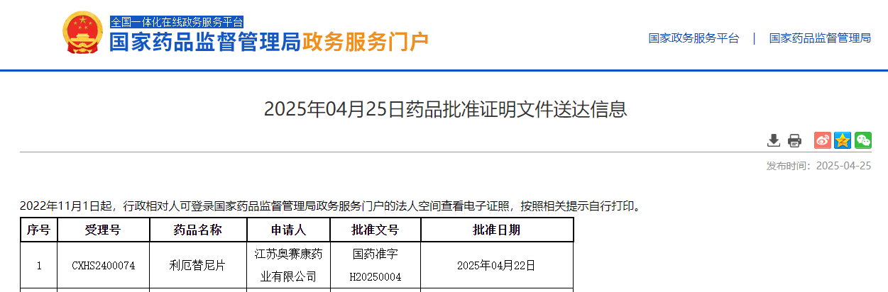 On April 25, 2025,Innovent Biologics announces that China’s National Medical Products Administration (NMPA) has approved the New Drug Application (NDA) for limertinib as the first-line treatment for adult patients with locally advanced or metastatic non-small cell lung cancer (NSCLC) harboring EGFR exon 19 deletions or exon 21 L858R mutations.