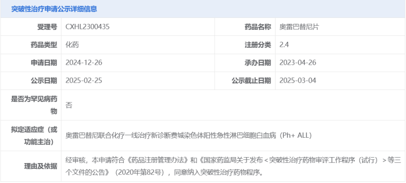 On March 5th, 2025,Ascentage Pharma announced that its drug, olverembatinib, has been granted a Breakthrough Therapy Designation (BTD) by the Center for Drug Evaluation (CDE) of China’s National Medical Products Administration (NMPA), for combination with low-intensity chemotherapy for the first-line treatment of newly-diagnosed patients with Philadelphia chromosome-positive (Ph+) acute lymphoblastic leukemia (ALL).