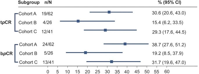 Between October 2020 and March 2022, a total of 129 patients from five hospitals were enroled in this study.Of the 129 patients enroled, 62 (48.1%) were identified as MRI-responders (cohort A), 26 non-responders continued with four more cycles of TCbH (cohort B), and 41 non-responders received additional pyrotinib (cohort C). The tpCR rate was 30.6% (95% CI: 20.6–43.0%) in cohort A, 15.4% (95% CI: 6.2–33.5%) in cohort B, and 29.3% (95% CI: 17.6–44.5%) in cohort C. Multivariable logistic regression analyses demonstrated comparable odds of achieving tpCR between cohorts A and C (odds ratio = 1.04, 95% CI: 0.40–2.70). No new adverse events were observed with the addition of pyrotinib. Patients with co-mutations of TP53 and PIK3CA exhibited lower rates of early partial response compared to those without or with a single gene mutation (36.0% vs. 60.0%, P = 0.08). These findings suggest that adding pyrotinib may benefit patients who do not respond to neoadjuvant trastuzumab plus chemotherapy. Further investigation is warranted to identify biomarkers predicting patients’ benefit from the addition of pyrotinib.