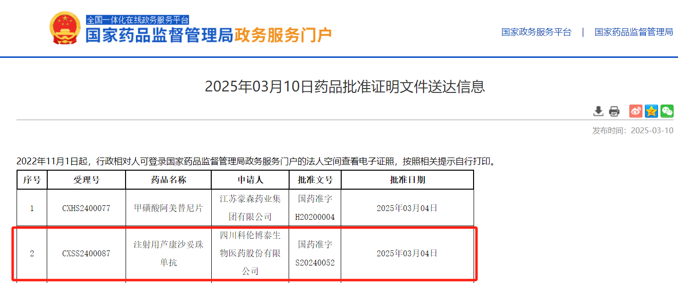 On March 10, 2025,Sichuan Kelun-Biotech announced that the Company’s trophoblast cell-surface antigen 2 (TROP2)-directed antibody-drug conjugate (ADC) sacituzumab tirumotecan (sac-TMT, formerly SKB264/MK-2870) was approved for marketing by the National Medical Products Administration (NMPA) for the second indication which is for the treatment of adult patients with epidermal growth factor receptor (EGFR) mutant-positive locally advanced or metastatic non-squamous non-small cell lung cancer (NSCLC) following progression on EGFR-tyrosine kinase inhibitor (TKI) therapy and platinum-based chemotherapy. This is the first TROP2 ADC drug approved for marketing in lung cancer globally. Compared with current standard of care, sac-TMT significantly extents the overall survival benefits of these patients.