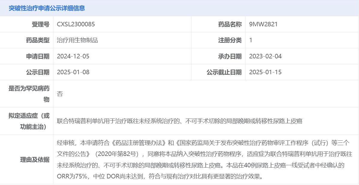On January 8, 2025, 9MW2821 was granted Breakthrough Therapy Designation (BTD) by the Center for Drug Evaluation (CDE) of the National Medical Products Administration (NMPA) in China.9MW2821 is given in combination with toripalimab, an anti-PD-1 monoclonal antibody, for treatment-naïve, unresectable, locally advanced or metastatic urothelial carcinoma(la/mUC).