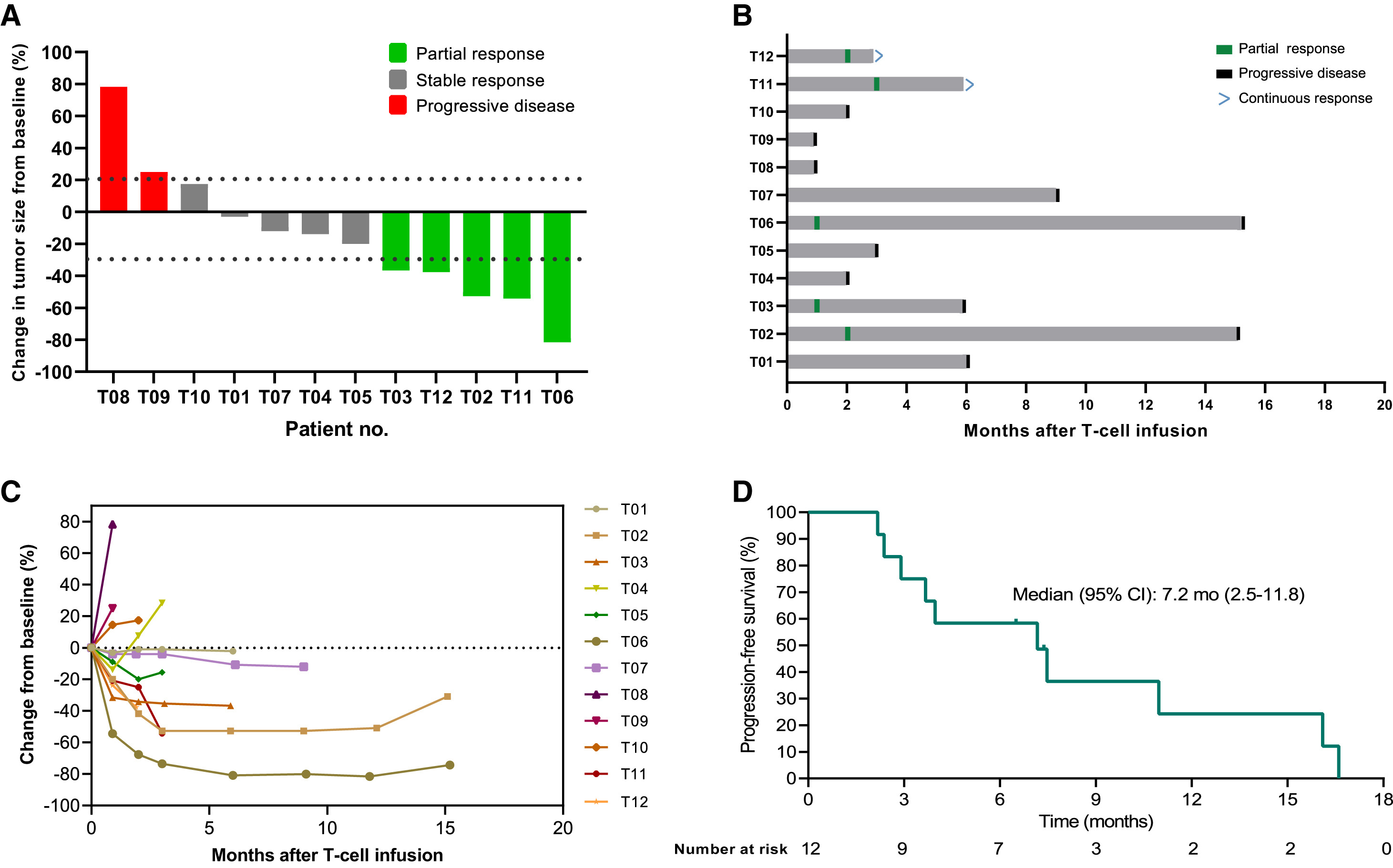 Notably, patient T06 (42-year-old male), who had received two prior lines of therapy and experienced grade 2 CRS after TAEST16001 treatment, exhibited a partial response of upper arm and multiple lung metastatic lesions after 4 weeks of cell infusion, maintaining more than 14 months following treatment . As the lung metastatic lesions remained a great partial response even at the time of progression, the patient underwent surgical resection of a lesion in the upper arm. Another patient, T02 (27-year-old male), who had recurrent myxoid liposarcoma in the right leg after receiving five surgeries, also exhibited a partial response and sustained more than 1 year following treatment.